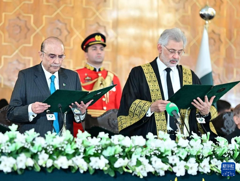 3月10日,在巴基斯坦伊斯兰堡总统府,巴基斯坦最高法院首席大法官卡齐·法伊兹·伊萨(前排右二)主持当选总统阿西夫·阿里·扎尔达里(前排右三)的宣誓就职仪式。巴基斯坦当选总统阿西夫·阿里·扎尔达里10日下午在巴首都伊斯兰堡总统府宣誓就职。新华社发(巴基斯坦新闻与广播部下辖媒体信息部门供图) 新华社伊斯兰堡3月10日电(记者蒋超)巴基斯坦当选总统阿西夫·阿里·扎尔达里10日下午在巴首都伊斯兰堡总统府宣誓就职。 巴基斯坦最高法院首席大法官卡齐·法伊兹·伊萨主持宣誓仪式。巴总理夏巴兹、国民议会(议会下院)议长萨迪克、前总统阿尔维、陆军参谋长穆尼尔、人民党主席比拉瓦尔等出席仪式。